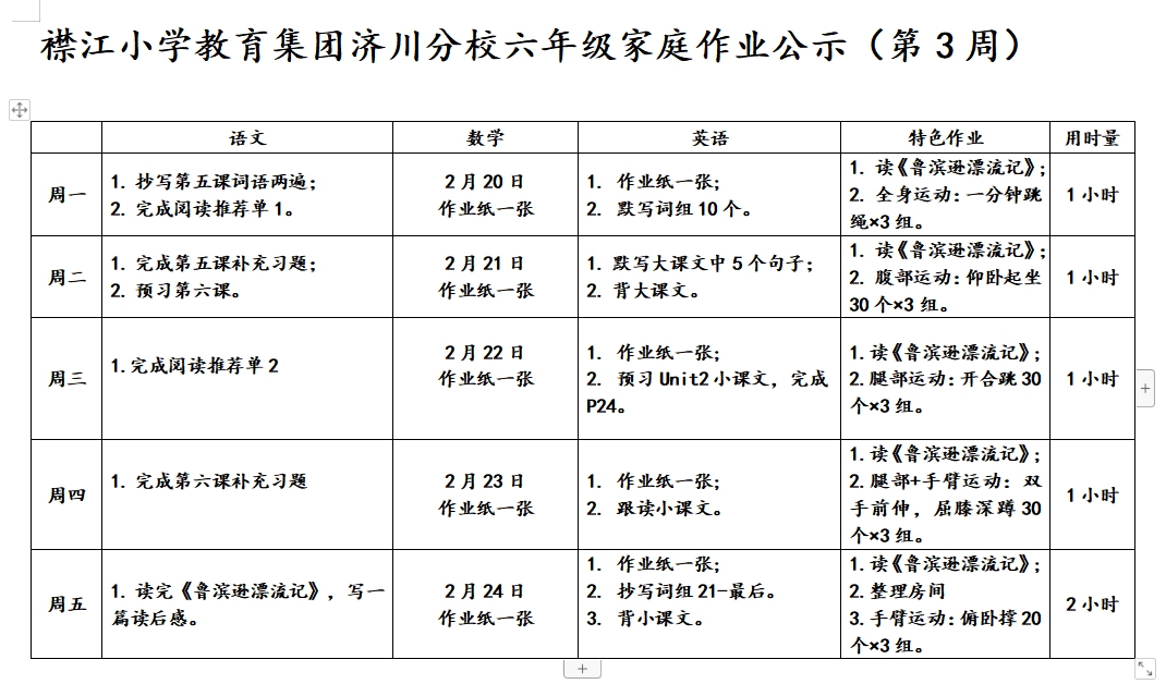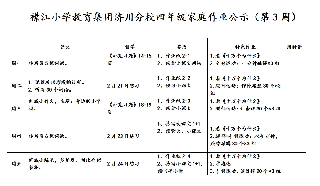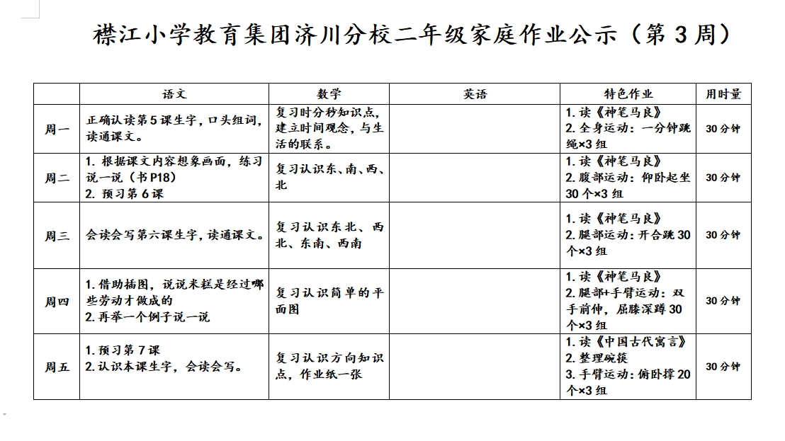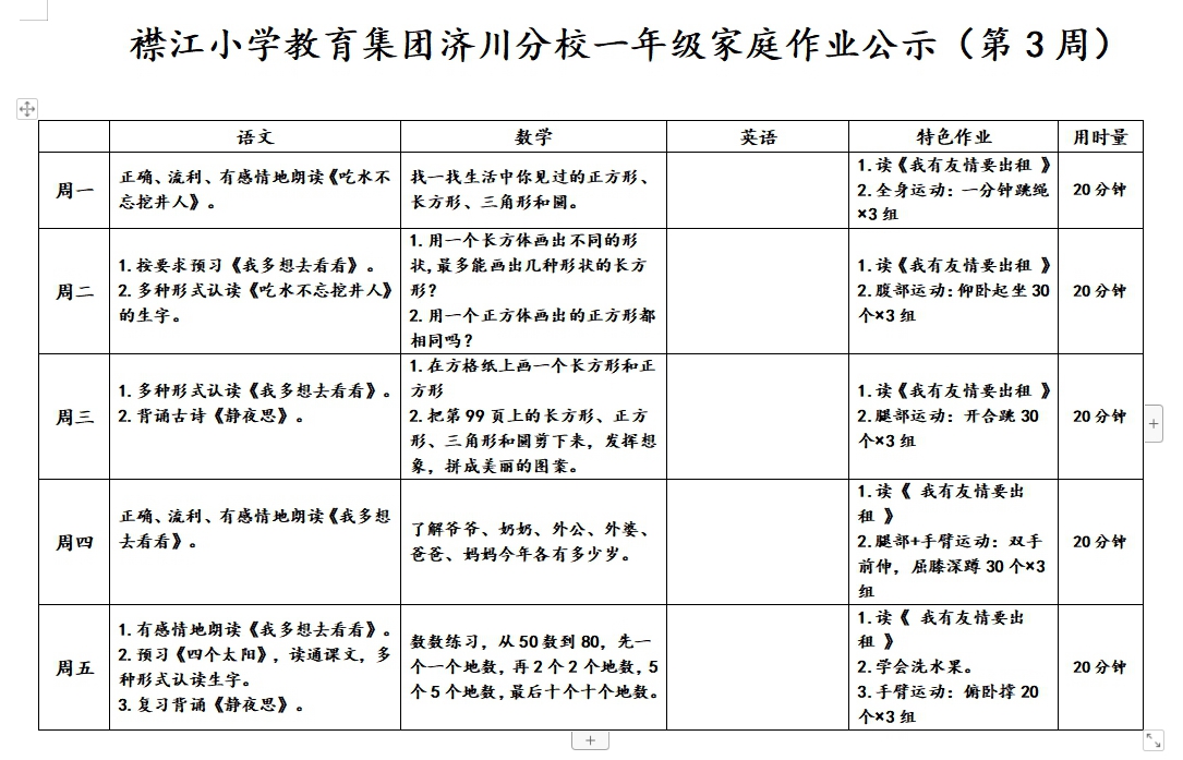 襟江小学教育集团济川分校家庭作业公示(第三周)